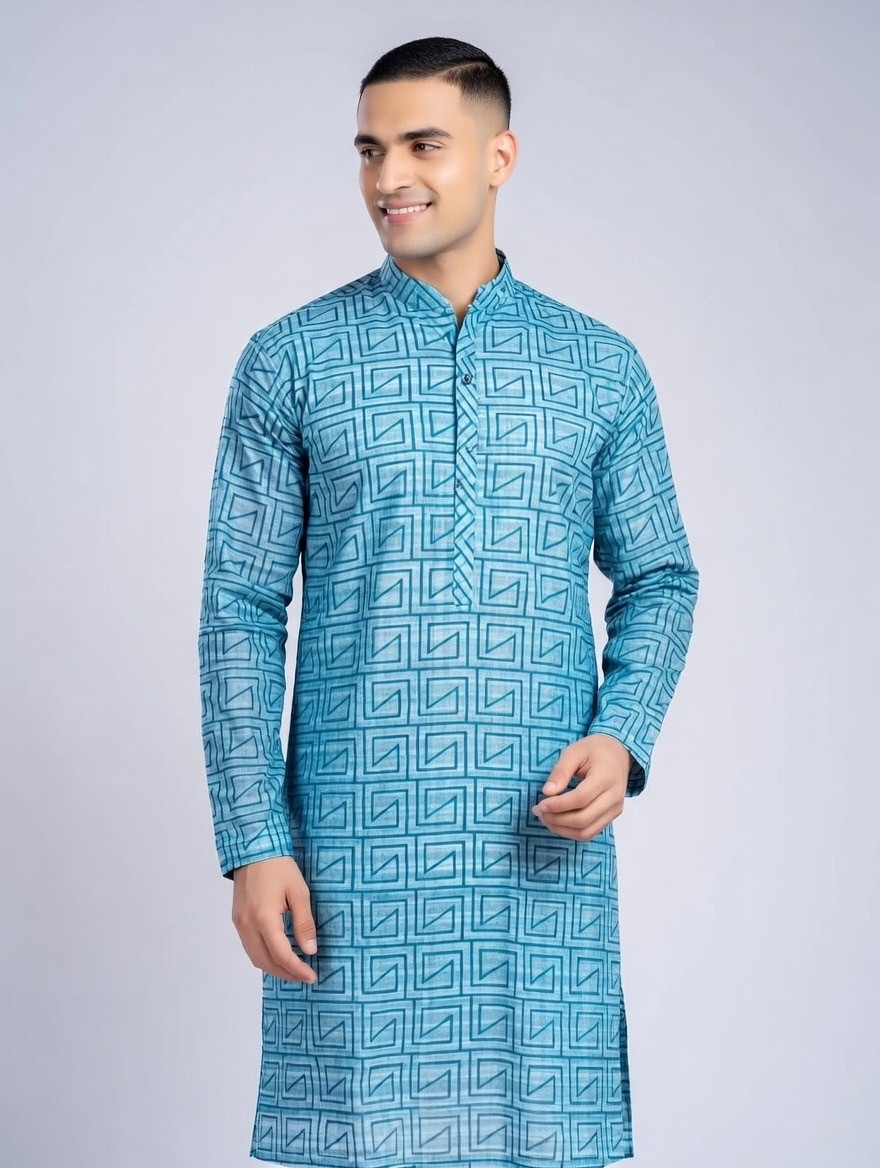 Aqua Geometric Premium Cotton Panjabi